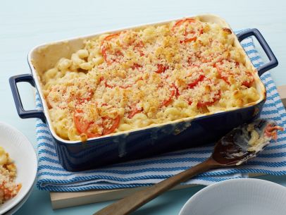 4. Slice the tomatoes and arrange on top. Melt the remaining 2 tablespoons of butter, combine them with the fresh bread crumbs, and sprinkle on the top. Bake for 30 to 35 minutes, or until the sauce is bubbly and the macaroni is browned on the top.