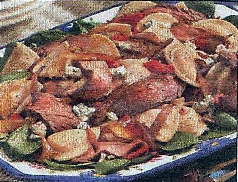 4)Whisk together vinegar,mustard and remaining salt and pepper. gradually whisk in oil. In large bowl combine red peppers,pierogies,onion and steak. Drizzle with dressing;toss. Arrange spinach on platter;top with steak mixture. Sprinkle with cheese.