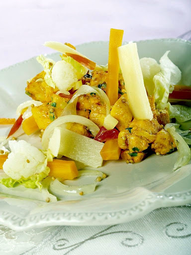Coat the chicken pieces thoroughly with this sauce and marinate in the fridge for 30 minutes. Put the chicken pieces in the ActiFry without any fat, add the heart of palm, drained and sliced, and then cook 10 minutes.