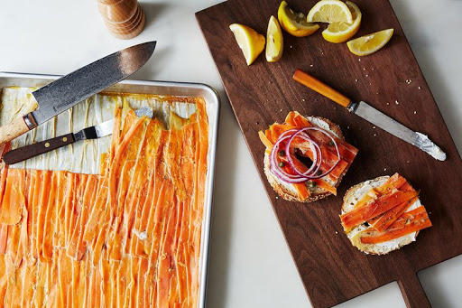 1. Peel and very thinly slice—they should be thin but they shouldn't be paper-thin or translucent—the carrots longways on a mandolin. In a small bowl combine the smoked salt, brown sugar, black pepper, and liquid smoke.