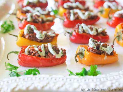 These Mini Taco Stuffed Peppers are miniature bell peppers stuffed with taco meat and drizzled with a cilantro cream sauce. They can easily be made prepared ahead of time for an easy appetizer.