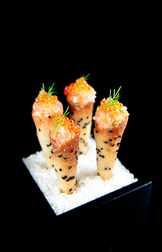. You’ll have to make a 4-inch plastic stencil to spread the tuile batter into perfect rounds. You will have to burn your delicate little fingers to shape the black sesame tuiles into cones and bake them to a golden brown without burning them. And I know what I’m talking about here [cough-cough]. The good news is that practice makes perfect and once you get the hang of it you’ll be making them by the dozen in a flash. I adapted the recipe a little and added salmon roe because it’s even more fun that way. Enjoy!