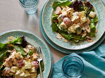 In a large bowl, toss the greens with the oil, lemon juice and salt and pepper, to taste. Arrange the greens on 4 individual plates, top with a scoop of the chicken salad and sprinkle with the almonds.