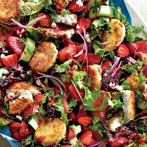 4. To serve, arrange salad greens on a serving platter; top with strawberries, cucumber, onion, and goat cheese croutons. Drizzle with vinaigrette, and garnish with dill sprigs.