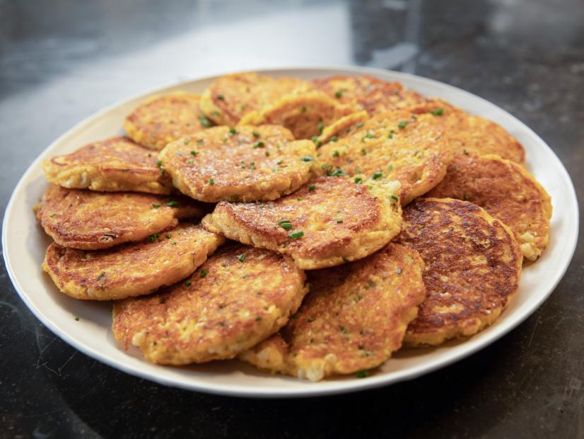 Heat 1 tablespoon of clarified butter in a large (12-inch) saute pan over medium heat until it sizzles. Drop 1/4-cup measures of batter into the pan without crowding them. Press each pancake very lightly with a small metal spatula. Cook for 2 minutes, turn, and cook for 1 1/2 minutes, until both sides are browned and the center of the pancake is firm. Place the pancakes on the prepared sheet pans and keep them warm in the oven while you cook the rest of the batter. Continue making the pancakes, adding more clarified butter to the pan, as needed. Sprinkle with salt and serve warm with a sprinkling of minced chives.