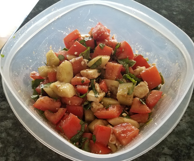 Chop the Tomatoes into 1/2 in sized chunks. I tend to quarter them, then remove the flesh (seeds and wet parts). This keeps the salad from getting to runny.