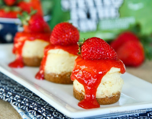 Once ready to serve, remove mini cheesecakes from the fridge, top with strawberry sauce, serve and enjoy!