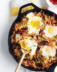 Uncover, and make 4 indentations in the rice with the back of a spoon. Crack 1 egg into each, and cook, covered, until whites are set but yolks are still runny, about 4 minutes. Stir eggs into rice.