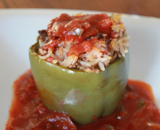 To assemble, pour the sauce into a deep casserole dish or small roaster (deep enough that you can cover the dish while the peppers are standing). Fill each pepper with the ground beef and rice filling, being sure to heap the filling a little at the top. Stand the peppers up in the sauce. When all the peppers are filled, cover the casserole dish and bake at 350 until the peppers are just fork-tender, about 45 minutes. Enjoy!