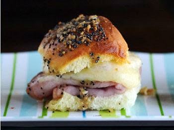 Put ham and cheese in between sliced rolls. Mix all other ingredients and spoon over sandwiches. Let set overnight or several hours.