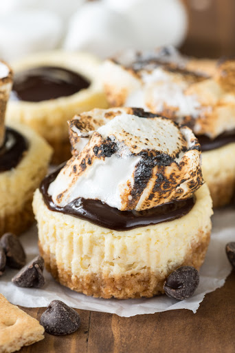 To assemble: spread ganache over the chilled cheesecakes. Toast a marshmallow over a gas stove or BBQ and place on top (or use a kitchen torch). Serve immediately after you've placed the marshmallow on top.