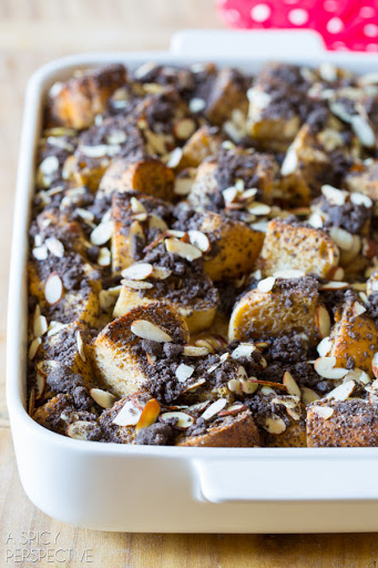 When ready to bake, pour the egg mixture over the chopped yeast rolls. Mix by hand so that all roll pieces are saturated, then sprinkle the top with chocolate almond crumble. Bake for 45-60 minutes until golden and bubbly. Jiggle the pan to make sure the center is firm.