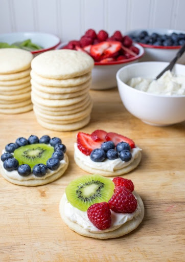 To serve: Either top the cookies with frosting ahead of time, or set out stacks of cookies and bowls of frosting, along with bowls of cut fruit. Let everyone decorate their own cookies with fruit.