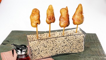 4 Skewer each dredged chicken tender on the top of an 8-inch wooden skewer. Working in batches, fry the dredged chicken until golden brown, about 7 minutes. Remove fried chicken skewers to a paper towel-lined plate. Allow chicken to cool slightly. Discard hot used oil in a cool pot. Replace with a couple of inches of clean oil and return to 360ºF.