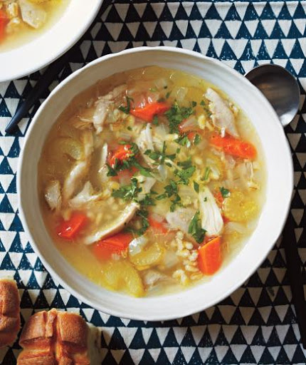 2. Add the carrots, celery, onion, ½ teaspoon salt, and ¼ teaspoon pepper to the reserved pot. Cook, stirring occasionally, until the vegetables are tender, 4 to 6 minutes. Add the broth, barley, and chicken and bring to a boil. Reduce heat and simmer, covered, until the chicken is cooked through and the barley is tender, 30 to 40 minutes.