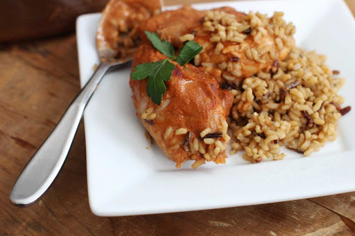 Return the skillet to medium-high and heat the vegetable oil. Season the chicken with salt, then add it to the skillet and cook for 3 minutes per side. Return the sauce to the skillet, stirring gently to cover the chicken. Return to a simmer, then reduce heat to maintain. Cover and cook for 5 minutes, or until the chicken reaches 165 F. Serve the chicken over rice, spooning mole sauce over the top.