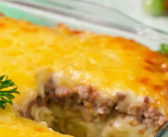Spread pasta in an even layer at the bottom of greased baking dish. Add beef and onion mixture on top, then top with the cheddar cheese. Bake for 20 minutes, or until cheese is bubbling and the edges are starting to brown.