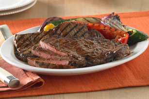 GRILL steaks 4 to 5 min. on each side or until medium doneness (160°F.) Brush steaks with steak sauce; let stand 10 min. Cut into thin slices to serve. Garnish with grilled cherry tomatoes, if desired. Kraft Kitchens TipsServing SuggestionBalance this grilled steak with smart side dishes, such as grilled vegetables and a mixed green salad for a delicious summertime dinner.Make AheadPlace steaks in large freezer-weight resealable plastic bag. Add dressing; seal bag. Freeze up to 2 months. Thaw in refrigerator, then grill as directed. The meat marinates as it thaws.