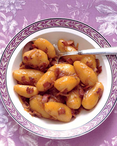 Bacon and chicken stock make a rich glaze for peeled fingerling potatoes in a sumptuous side dish. Homemade stock adds body to the glaze, but store-bought also works well.