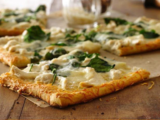 Meanwhile, in medium bowl, mix Alfredo sauce and chicken; spoon evenly over partially baked crust. Top with spinach and cheese.