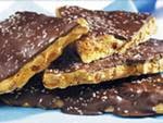 Meanwhile, place sugar and corn syrup in a large pyrex measuring cup or bowl; mix well. Microwave on HIGH for 4 minutes. Stir in almonds. Microwave on HIGH for an additional 4 minutes. Stir in butter, half of the salt, and vanilla. Microwave on HIGH 1 minute. Add baking soda, stir and quickly pour mixture onto parchment paper-lined baking sheet. Spread out using lightly greased metal spatula. Let cool 5 minutes; pour melted chocolate over top, spreading to coat. Cool slightly before sprinkling with remaining salt. Cool completely and refrigerate; break up into pieces.