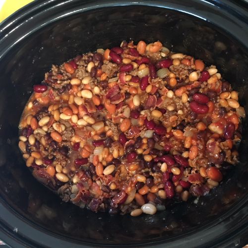 If your slow cooker isn't big enough just eliminate a can or two of beans (not baked beans).