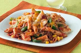 DRAIN pasta. Add to chicken mixture; mix lightly. Top with cheese. Remove from heat; cover. Let stand 1 min. or until cheese is melted.