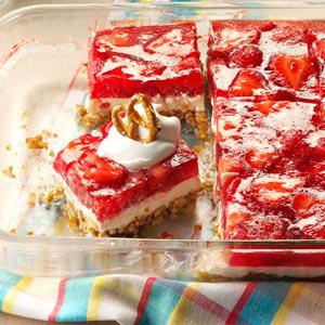 2Stir together crushed pretzels, melted butter and 3 tablespoons sugar; mix well and press mixture into the bottom of a 9x13 inch baking dish.