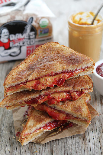 Spread the inside pieces of bread with peanut butter and jam. Make a sandwich and cut in half. Serve immediately.