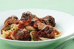 COOK spaghetti as directed on package; drain. Serve meatballs with sauce over spaghetti. Sprinkle with cheese.