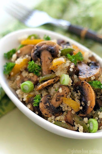 Scoop the cooked quinoa out of the rice cooker and add it into the mushroom- pepper mixture. Add in the sliced scallions. Stir to combine. Squeeze fresh lemon juice all over the quinoa and drizzle with extra virgin olive oil. Toss to coat the quinoa. Taste test and add more salt or seasoning if it needs it. Sprinkle with toasted pine nuts, if desired. Serve immediately; or allow it to cool, then cover and refrigerate it to eat as a salad. Note on chilling this quinoa: Before serving this quinoa cold, taste test again and adjust seasonings; chilling often dulls the flavors in these kinds of salads. I usually allow quinoa salad a few minutes out of the fridge before serving; letting it to come to room temperature helps the flavors. If making ahead as a salad, I'd use water instead of broth- personal preference.