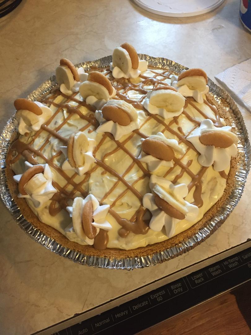 Drizzle pie with 2 tablespoons peanut butter. Pipe dollops of whipped cream around the edges of the pie and top each dollop with a slice of banana and a Nilla wafer.