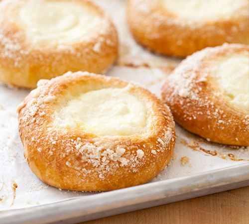 Brought to America by Czech immigrants and popular in Texas, these sweet pastries are heaped with either fruit or cheese filling. Many recipes call for mixing the dough gently, but we found that lengthy kneading yielded a more supple dough that held air well, giving our kolaches a lighter crumb, while increased egg yolks and butter tenderize the dough. A greased and floured measuring cup makes even indentations in the formed pastries, and a sweet cheese or tangy fruit filling comes together easily and is spooned inside before baking.