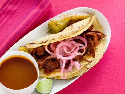 Use tongs to divide the meat among the tortillas. Top with pickled onions; serve with the remaining cooking liquid and lime wedges.