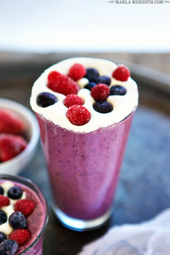 Blend all ingredients (excluding whipped cream) on a "smoothie" or "shake" blender setting. Top with fresh whipped cream & some more frozen berries.