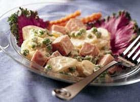 3.Remove from heat; stir in mayonnaise and mustard. Stir in ham and peas. Spoon into serving bowl; cover and refrigerate 3 to 4 hours or until chilled. Stir before serving.