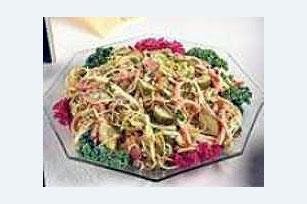 ADD coleslaw blend, ham, cheese, pickles, onions and parsley; toss to coat. Cover.