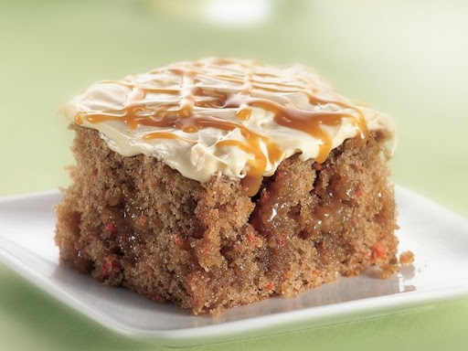 Set aside 2 tablespoons of the reserved 1/2 cup caramel topping. Stir remaining topping into frosting; spread over top of cake. Drizzle with reserved 2 tablespoons caramel topping. Store covered in refrigerator.