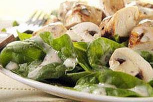 TOSS spinach with mushrooms; top with chicken. Drizzle with reserved 1/2 cup dressing mixture just before serving.