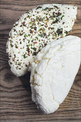 Fill a large bowl with cool water. Use a skimmer or strainer to transfer the halloumi for a brief dunk in the water, making the cheese just cool enough to handle yet still warm and pliable. Flatten the round to a thickness of about 3/4 inch, making it 8 inches wide. Sprinkle each side with the salt and the dried herbs, if using. Fold the cheese in half to form a half-moon. Drain on the mat for 1 hour. Wrap the cheese well and store it for 3 hours before serving to allow the salt to penetrate the cheese.