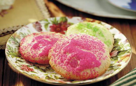 Shape dough into 1/2-inch balls. Arrange on baking sheets. Flatten with a cookie stamp or bottom of a small glass dipped in colored sugar crystals. Bake until golden, about 12 to 15 minutes.