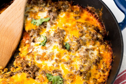 Once cornbread is done baking, reduce oven to 350 degree F. Poke holes in cornbread with a fork and pour enchilada sauce over it. Top with ground beef and shredded cheese, and cover with aluminum foil. Bake in oven for 20 minutes. Remove foil and back until cheese begins to brown, about 5-10 minutes.