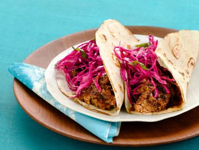 Remove the brisket from the pot and let rest 15 minutes. Meanwhile, discard the bay leaves and put the pot with the braising liquid over medium heat; simmer until thickened, about 20 minutes. Squeeze the roasted garlic out of its skin and whisk into the liquid. Taste and season with salt and pepper, if necessary. Thinly slice the brisket against the grain and toss with some of the roasted garlic sauce. Warm the tortillas; fill with the brisket and top with slaw.