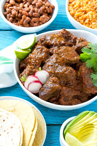 For the meat: Preheat the oven to 325 degrees. Heat the oil in a large pot. Season the beef with salt and pepper to taste. Place the meat in the pot in a single layer and cook for 4-6 minutes or until browned. You may need to do this step in batches.Place all of the browned meat into the pot and pour the sauce over the top. Cover the pot and bake for 3 hours or until meat is very tender. Serve the meat with tortillas, Mexican rice, pinto beans, chopped cilantro, cheese, lime wedges, radishes and sour cream.