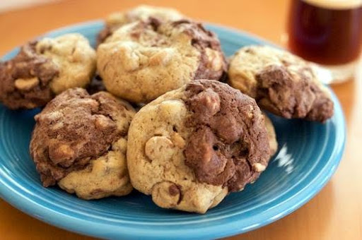 In a small bowl whisk together the flour and baking soda. Add the dry ingredients to the wet mixture and mix on low speed just until absorbed. Divide the mix in half and sift the cocoa into one part; use a rubber spatula to thoroughly incorporate. Combine the chocolate and cappuccino chips in a small bowl and stir half into each of the two doughs.