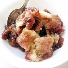 7) Dollop the cake batter atop the berries, spreading it out as best you can. Don't be too particular about making it perfectly smooth; the dessert will bake up unevenly anyway, so don't fuss.