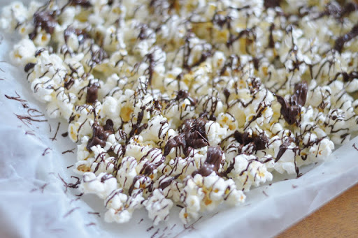 Toss the just popped popcorn with the coconut oil and sea salt. Pour out onto a baking sheet lined with parchment paper. Heat the dark chocolate in the microwave for about 30 seconds, stirring to make sure it's completely melted. Take a fork or spoon and drizzle the melted chocolate all over the popcorn. Place in the fridge for 5-10 minutes or until the chocolate has set.