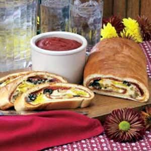 Sprinkle with the pepperoni, mozzarella cheese, mushrooms, pepper rings, green pepper and olives. Roll up, jelly-roll style, starting with a long side; pinch seam to seal and tuck ends under.