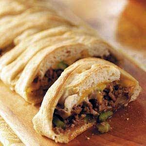 Unroll pizza dough onto a greased baking sheet. Roll into a 15 in. x 8 in.rectangle. Spoon meat mixture down the center. Sprinkle with cheeses.