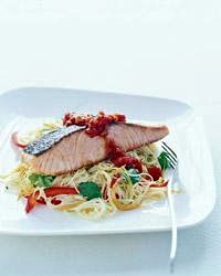 Spoon the vermicelli onto plates, top with the salmon and tomato jam. Garnish with cilantro and serve with lime wedges.